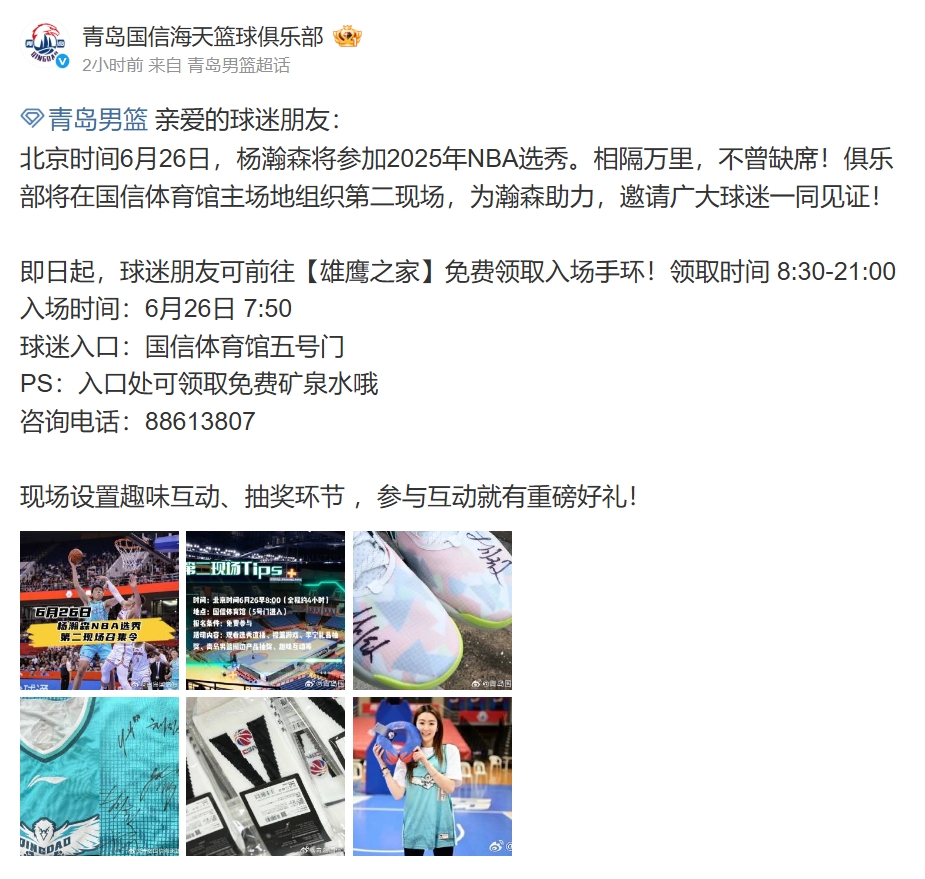 06月23日讯 青岛官方今日对青岛球迷做出邀约,邀请球迷在6月26日来到青岛男篮主场,参与见证杨瀚森选秀的活动。