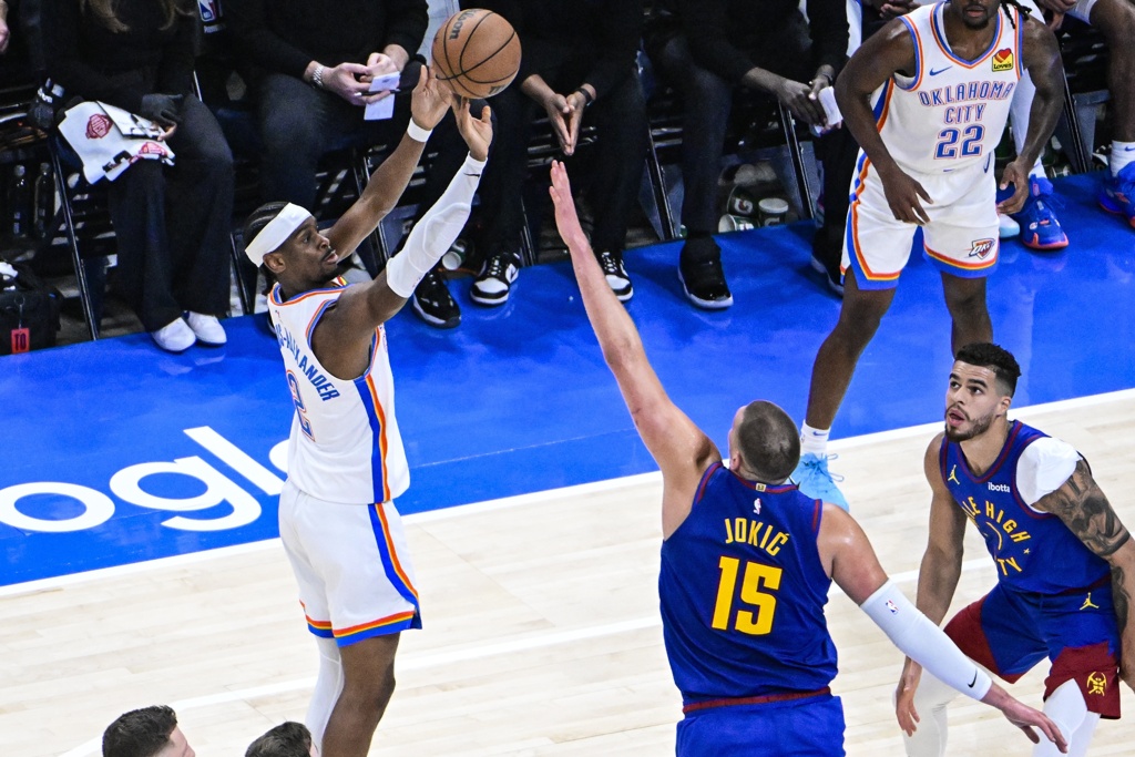 雷霆VS掘金这轮系列赛打到现在的实质:谁的投射更准,谁就能先动摇防守尤其迫使联防变为盯人,先帮自己一对一无解的MVP解套。