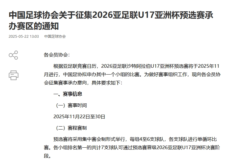05月22日讯 根据亚足联竞赛日历,2026亚足联沙特阿拉伯U17亚洲杯预选赛将于2025年11月进行,中国足协拟申办其中一个小组的比赛,发布2026亚足联U17亚洲杯预选赛承办赛区的通知。