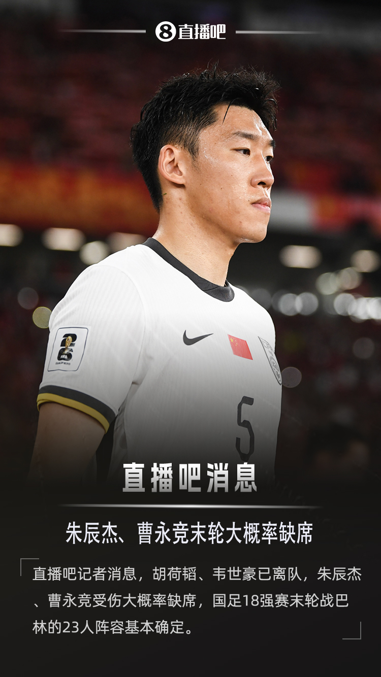 直播吧:朱辰杰、曹永竞大概率缺席,国足战巴林23人阵容基本确定