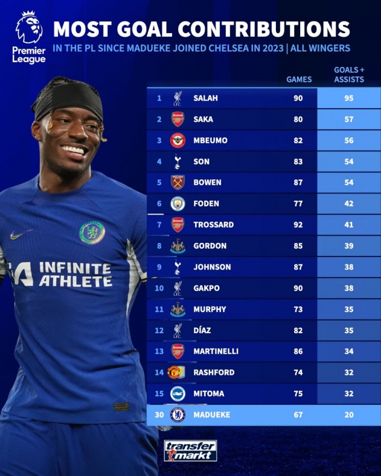 枪迷有信心吗?马杜埃凯在蓝军67场英超造20球,同期边锋仅排第30