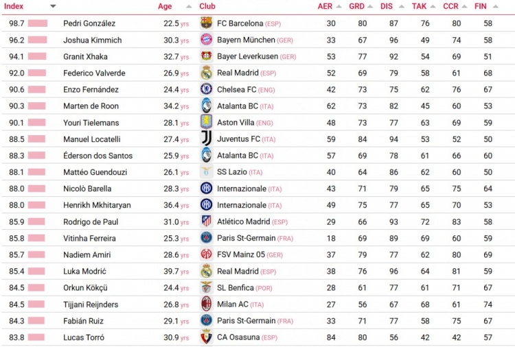CIES评最佳防守中场TOP20:佩德里、基米希、扎卡位居前三